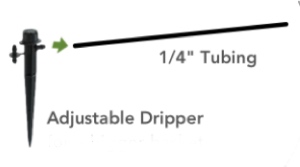 Push the open end of the micro-tubing over the barbed inlet on the adjustable dripper stake. Push stake into soil to secure in place. Additionally, you can use two adjustable drippers from one feedline by splitting the feedline in two directions using a ¼” barbed tee fitting. Illustration coming soon. (insert illustration)